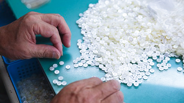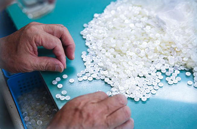 原貝の選定から仕上げまで、複数の工程を重ねて貝ボタンは完成します。素材の特性を見極めながら、工程ごとに品質を確認し、安定した仕上がりを追求しています。
